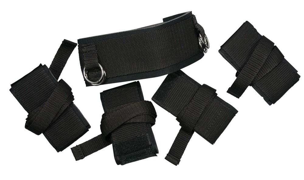 Wspaniały zestaw, który można stosować pojedynczo lub w dowolnej kombinacji ! Odporne na rozdarcie wąskie paski łączą ze sobą wyściełane mankiety dłoni i stóp z obrożą na szyi. Paski ( długość 132 cm ) mają regulowaną długość, dzięki czemu możliwa jest prawie wyprostowana postawa. Możliwych jest również wiele innych pozycji, ponieważ mankiety zakładane na dłonie i kostki można również odpiąć od obroży, a wiązanie wykorzystać aby przymocować do krzesła, łóżka, stołu, drzwi itp. Wyobraźnia nie zna granic ! Wszystkie mankiety zapinane są na rzepy. Materiał :