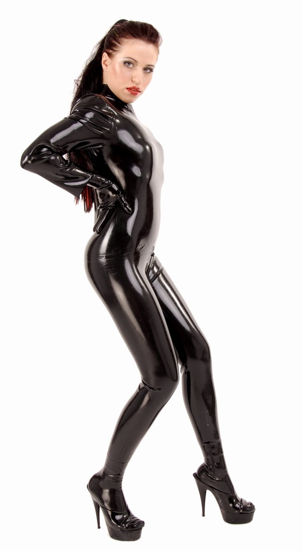 Wspaniały całościowy kombinezon z czarnego latexu dla każdego, kto pragnie wzbudzać pożądanie i uwielbia eksperymentować w sypialni.