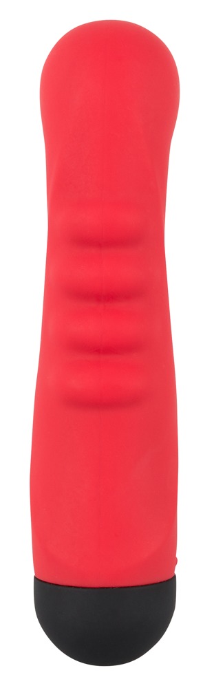 Czerwony wibrator zachwyca swym nietypowym kształtem - lekko zakrzywiona i pulchna główka znajduje się na karbowanym / żebrowanym trzonie.