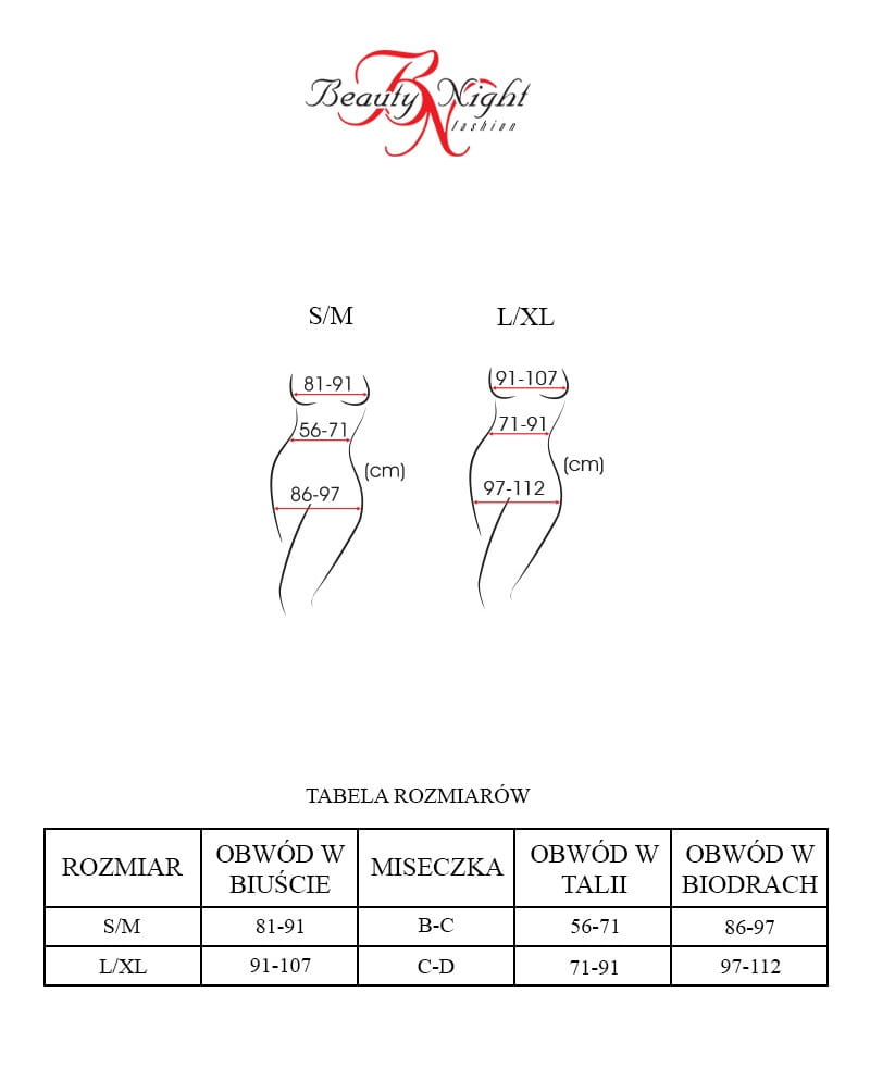 - Rozmiar S/M najlepiej prezentuje się przy wymiarach : Biust: 81-91 cm, Miseczka B/C, Talia: 56-71 cm, Biodra: 86-97 cm