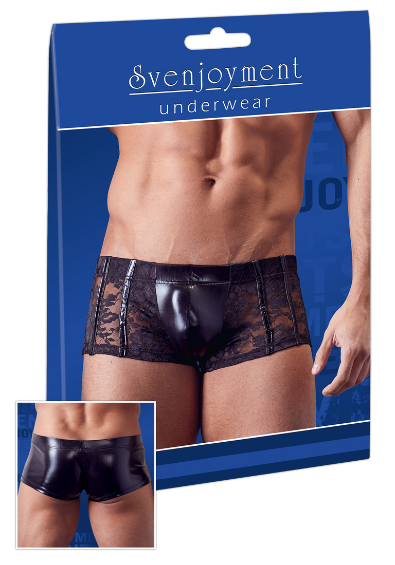 Przyciągające spojrzenie połączenie materiałów ! Te dopasowane czarne bokserki zachwycają kombinacją materiałów : kwiatowej koronki i błyszczącego materiału o ,,mokrym wyglądzie" typu wetlook, z którego wykonano cały tył bokserek, kieszeń na penisa oraz ozdobne pionowe przeszycia.