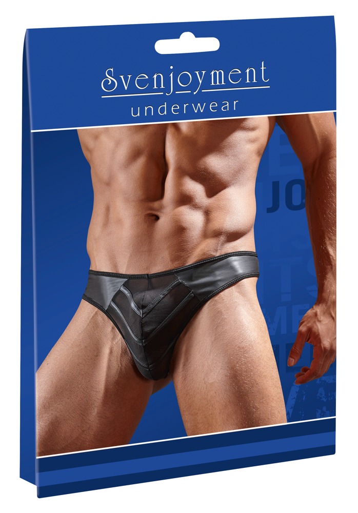 Czarne, szalenie seksowne męskie stringi wykonane z elastycznej matowej tkaniny w połączeniu z przezroczystymi, siateczkowymi wstawkami.