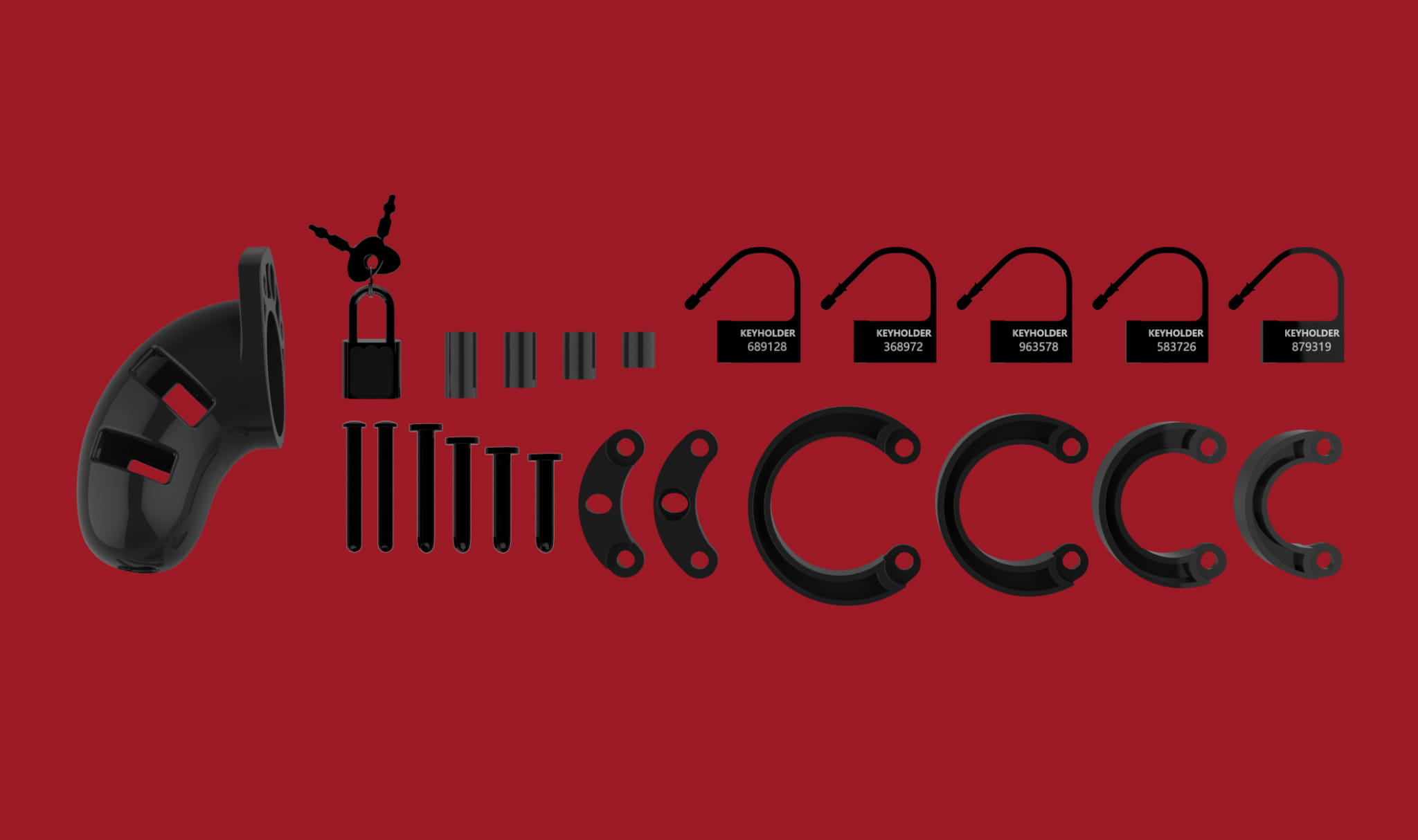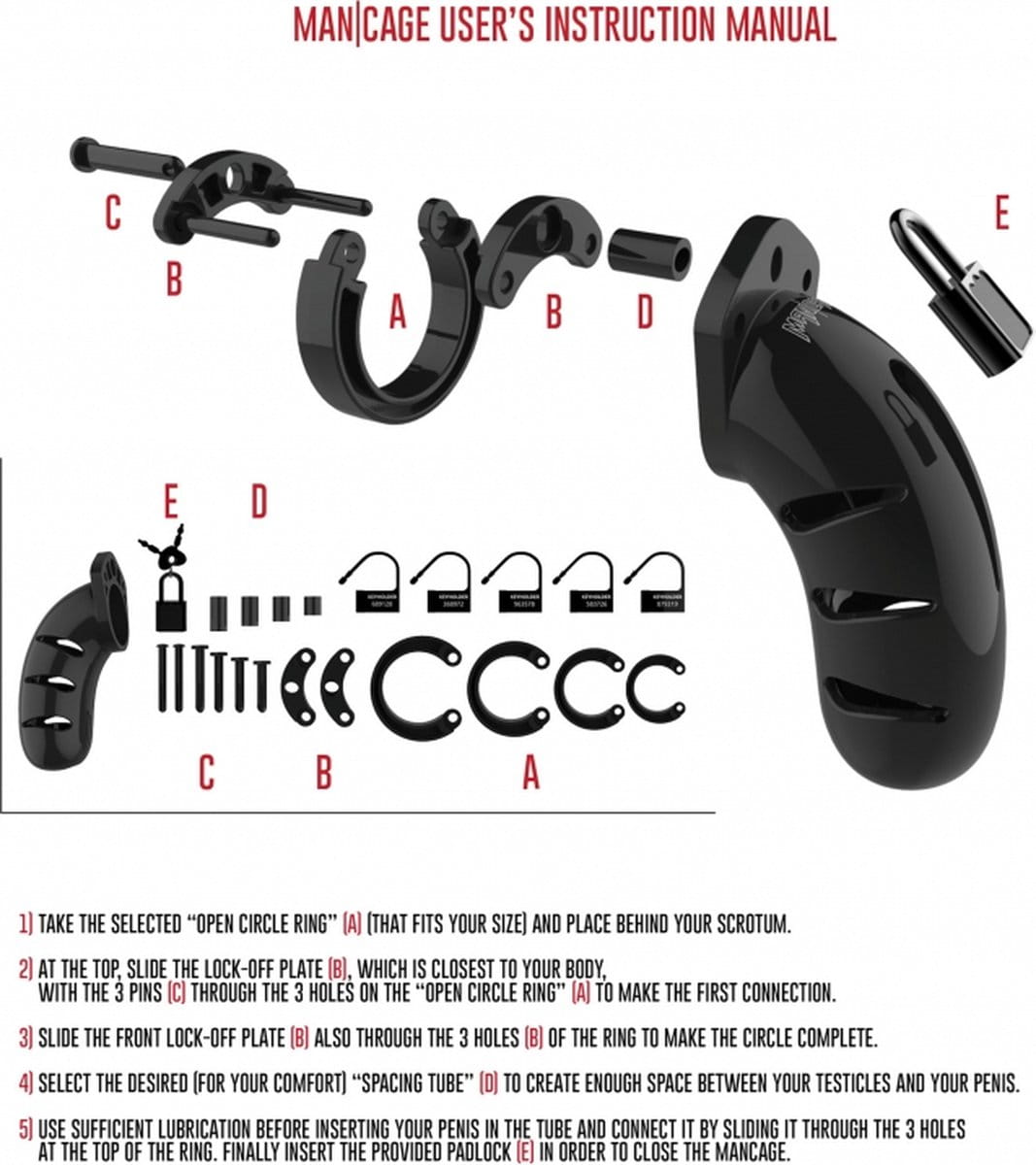 Zabawka erotyczna zapakowana jest w efektowne opakowanie - rozkładane kartonowe pudełko. Zawartość opakowania : 4 pierścienie w rozmiarach 45 / 50 / 55 i 60 mm, oraz 6 zamków ( 1 metalowy i 5 plastikowych pasków ). Maksymalny czas noszenia pasa cnoty - do 4 godzin ( krótkoterminowy ).