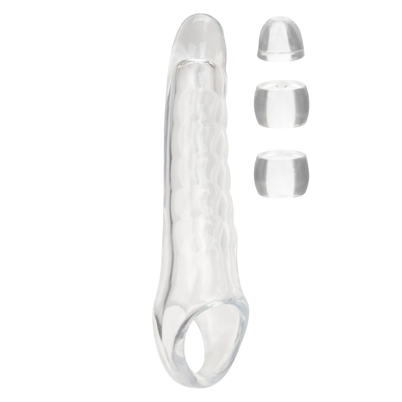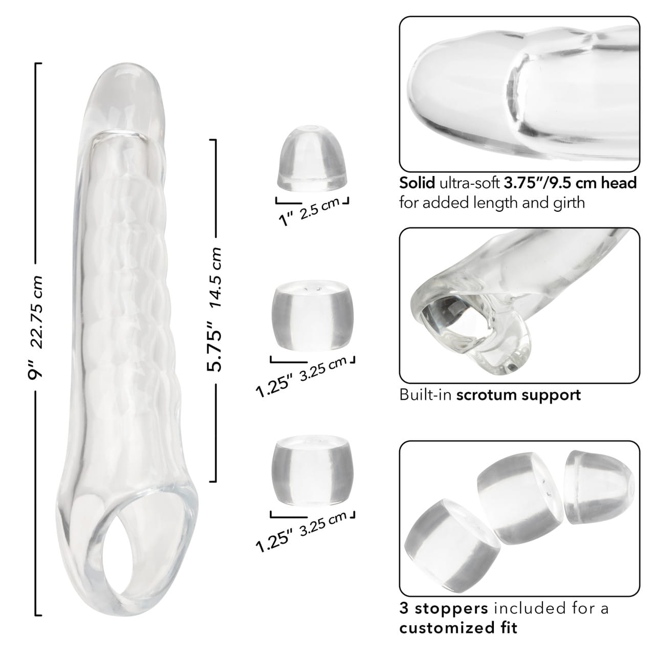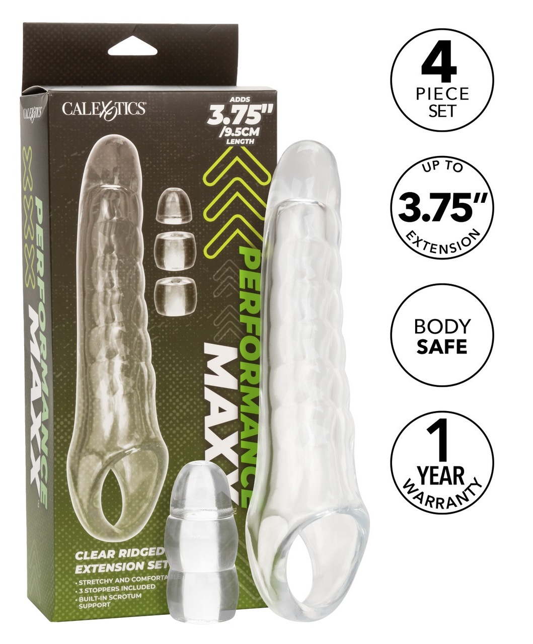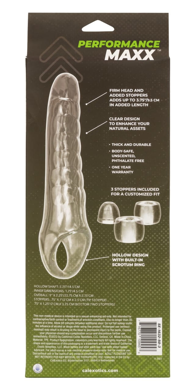 Zestaw przedłużający do Twojego penisa Performance Maxx™ Clear to rewolucyjne narzędzie zaprojektowane w celu udoskonalenia i zintensyfikowania Twoich intymnych spotkań. Nakładka wyposażone jest w solidną, lecz bardzo miękką główkę o długości 9,5 cm, która zapewnia zarówno dodatkową długość penisa, jak i obwód, oferując w zamian głęboko satysfakcjonujące doświadczenie dla Ciebie i Twojego Partnera. Zestaw przedłużający penisa Performance Maxx™ Extension Kit jest elastyczny i przezroczysty, dzięki czemu podkreśla Twoje naturalne atuty, zachowując jednocześnie bardzo realistyczny wygląd. Jego konstrukcja jest uzupełniona wbudowanym ringiem służącym do nałożenia na mosznę, co znacząco zwiększa stabilność gadżetu, ale także wpływa na siłę i długość trwania stosunku. Dołączenie 3 przezroczystych stoperów pozwala na indywidualne dopasowanie nakładki, uwzględniając indywidualne preferencje i zapewniając maksymalny komfort użytkowania. Gadżet jest wykonany z bezpiecznego dla ciała, bezzapachowego i wolnego od ftalanów materiału. To zaangażowanie w jakość zapewnia bezproblemowe i przyjemne doświadczenie przy każdym użyciu. Zestaw Performance Maxx™ Extension Kit to nie tylko łatwe i szybkie przedłużenie Twojego penisa. To brama do odkrywania nowych wymiarów przyjemności i wzmacniania intymnych chwil. Używaj tylko i wyłącznie lubrykantów na bazie wody. Po użyciu umyj letnia wodą z dodatkiem łagodnego mydła.