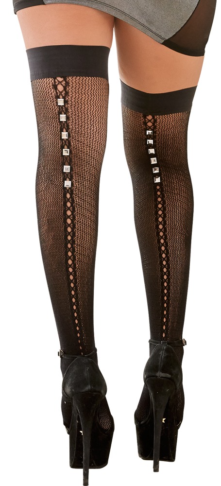 Te pończochy kabaretki sprawią, że będzie się działało erotyczne kino ! Czarne, siatkowe pończochy samonośne z dużymi otworami na tylnym szwie. Kwadratowe i błyszczące nity dodatkowo będą przyciągać jego wzrok. Czarne kabaretki z przeszyciami sprawią, że Wasze wspólne spotkanie w sypialni będzie jeszcze bardziej ekscytujące i śmiałe. Tylny szew pończoch jest bardzo sexy : na samym końcu linii otworów błyszczą intrygująco kwadratowe nity. Pończochy są samonośne dzięki antypoślizgowemu paskowi silikonu na szerokiej gumie.