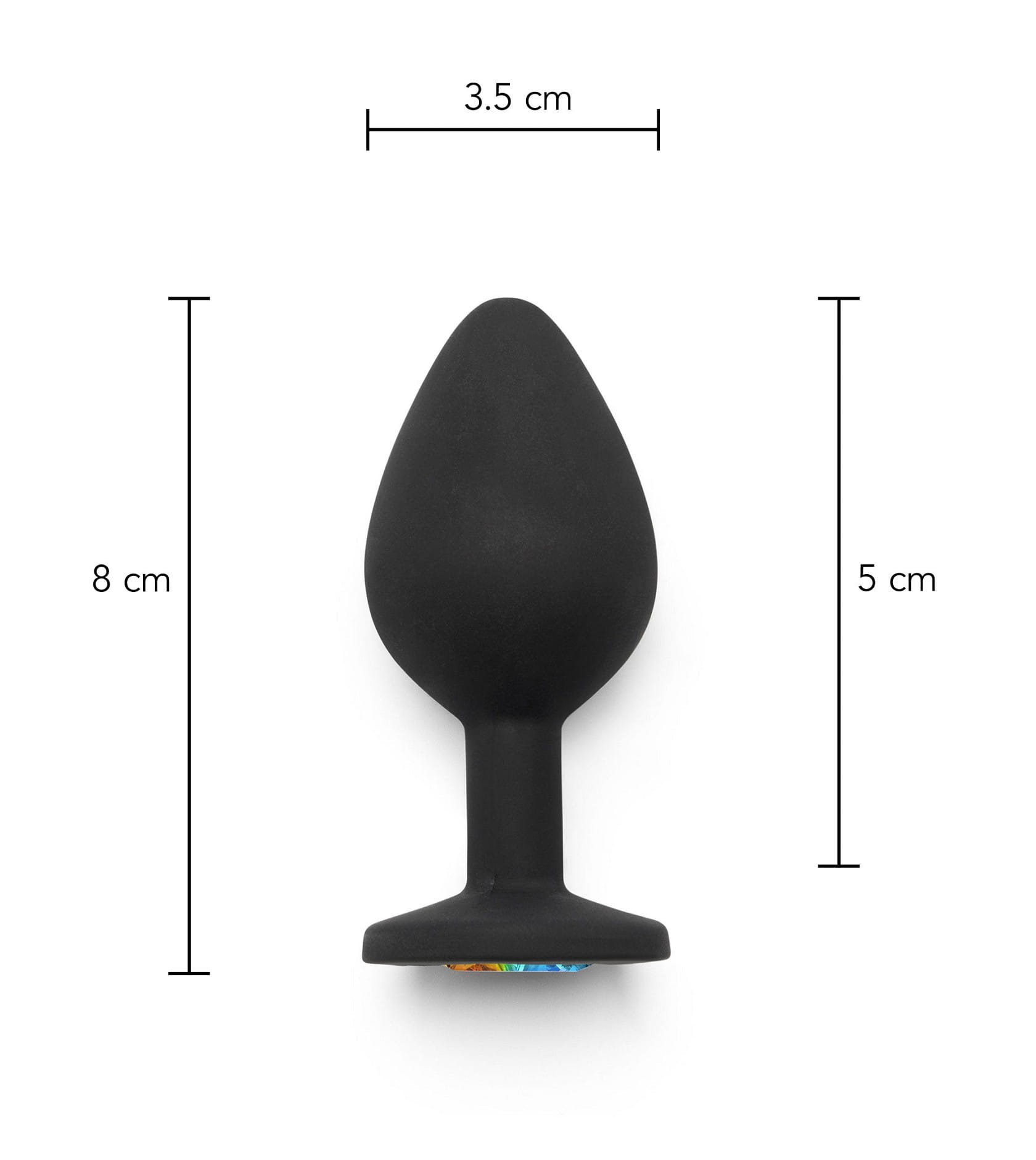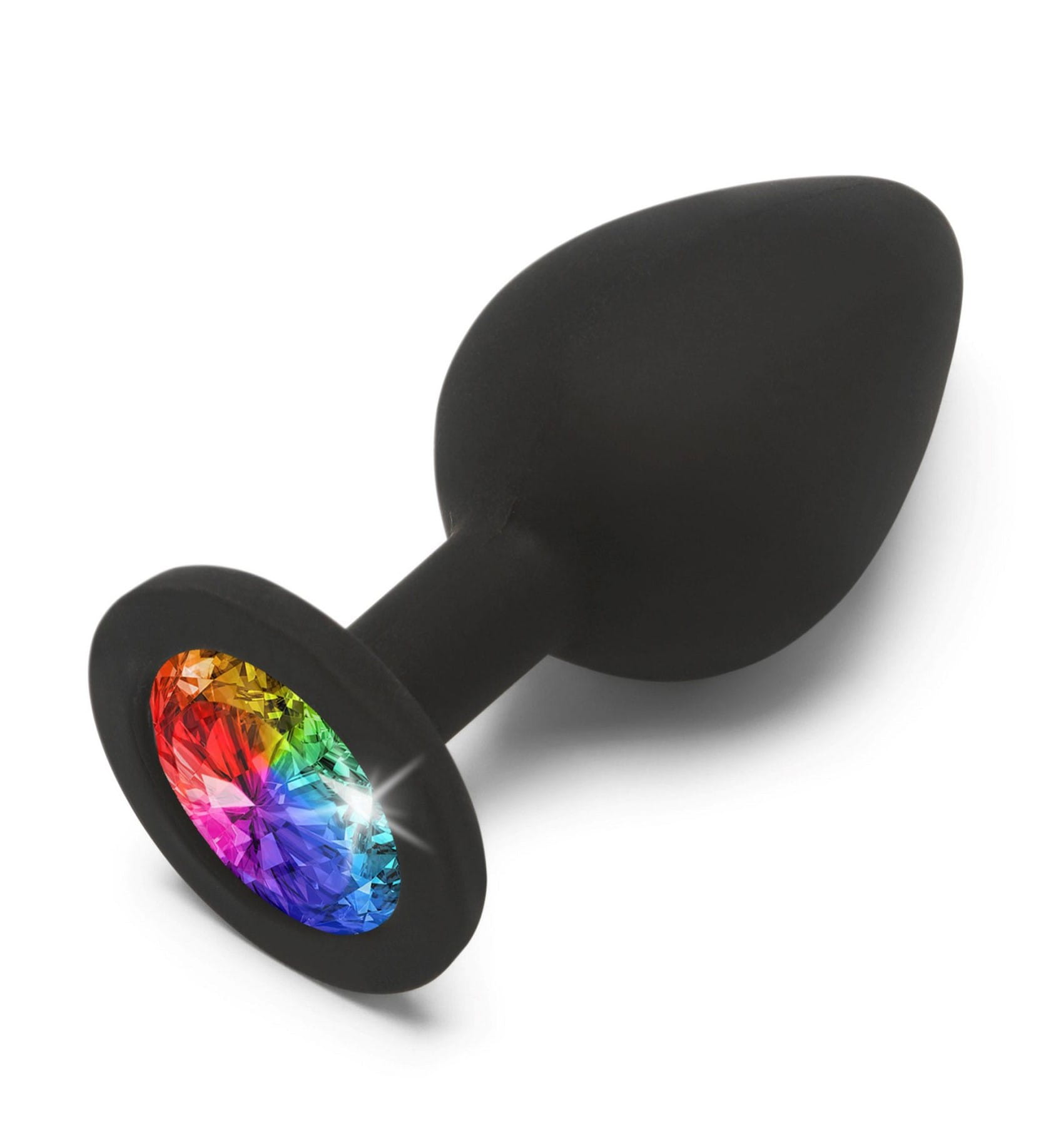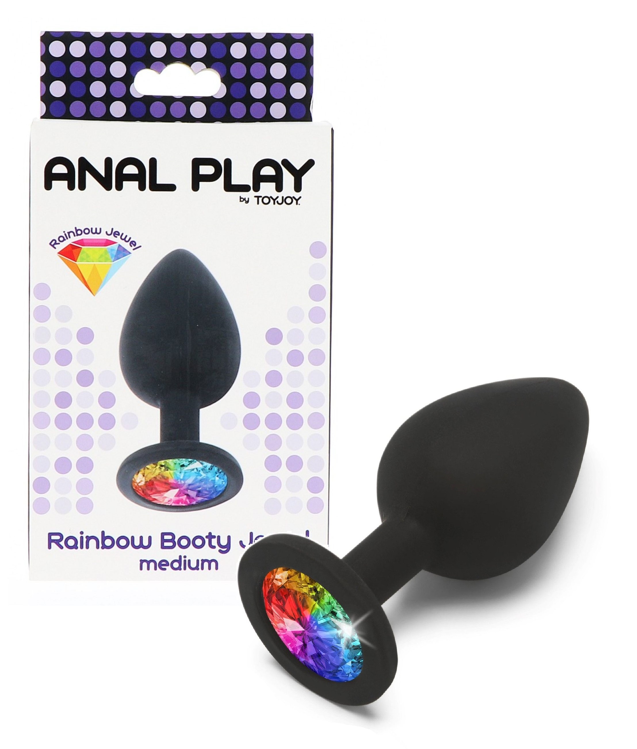 Rainbow Booty Jewel to wysokiej jakości silikonowy korek analny z wielobarwnym kamieniem w podstawie, dzięki czemu penetracja tą zabawką będzie błyszczała radością. Elegancki korek analny ma klasyczny kształt tulipana, czyli zwężającą się sylwetkę i rozszerzoną podstawę ozdobioną błyszczącym w kolorach tęczy kamieniem. Wykonany z najwyższej jakości silikonu medycznego Diamond Booty Jewel jest aksamitnie gładki w dotyku i całkowicie bezpieczny dla ciała. Jest to gadżet typu unisex, który doda blasku Waszym analnym przygodom. To niezbędny element każdej kolekcji Anal Play. Pamiętaj o używaniu ulubionego lubrykantu na bazie wody. Po użyciu umyj gadżet letnią wodą i delikatnym mydłem, lub środkiem do czyszczenia zabawek erotycznych typu ToyCleaner.