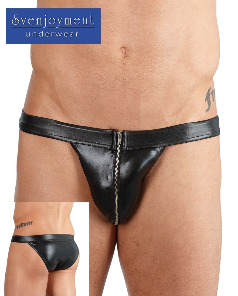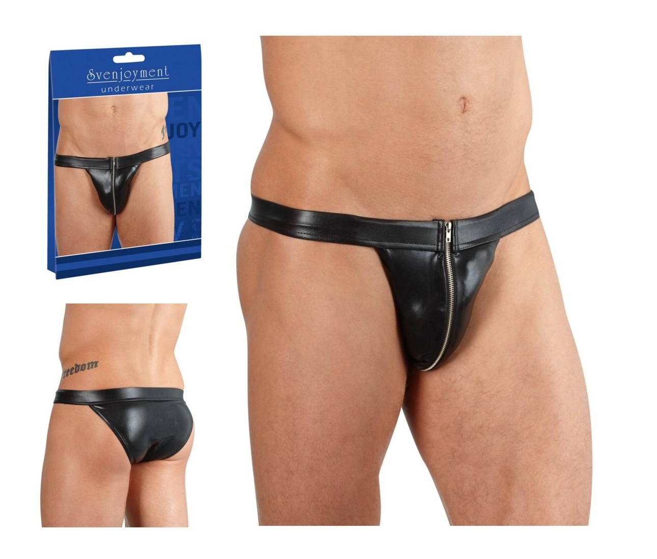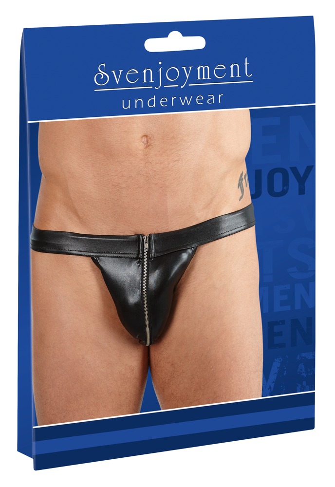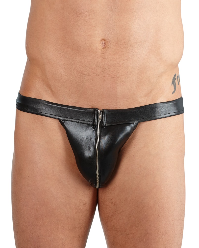 Czarne slipy męskie wykonane z błyszczącego materiału Wetlook. Wysoko wycięta kieszeń na penisa zapinana jest na zamek błyskawiczny z przodu.
