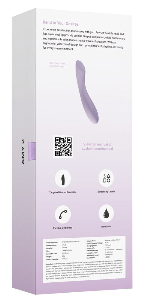 Ergonomicznie idealnie zakrzywiony wibrator Amy 2 od SVAKOM ze specjalnie wyprofilowaną i spłaszczoną końcówką do ukierunkowanej stymulacji punktów przyjemności w ciele i na ciele. Unikalna, płaska głowica owalna w wibratorze Amy 2 zapewnia szeroką i precyzyjną stymulację łechtaczki i punktu G. Jej kształt został zaprojektowany tak, aby dopasowywać się do naturalnych konturów Twojego ciała, zapewniając komfortowe i satysfakcjonujące doznania.