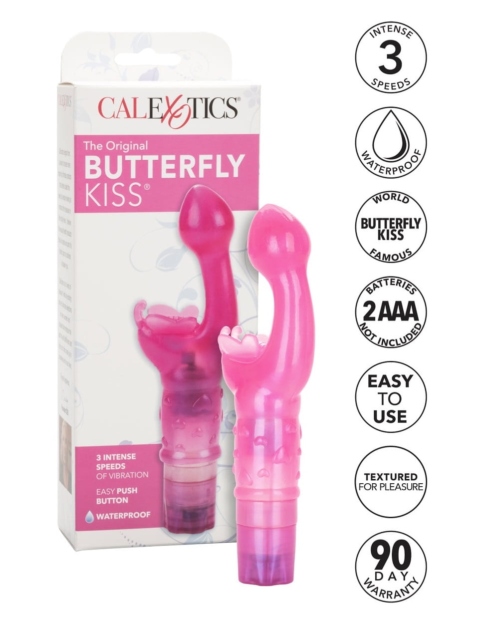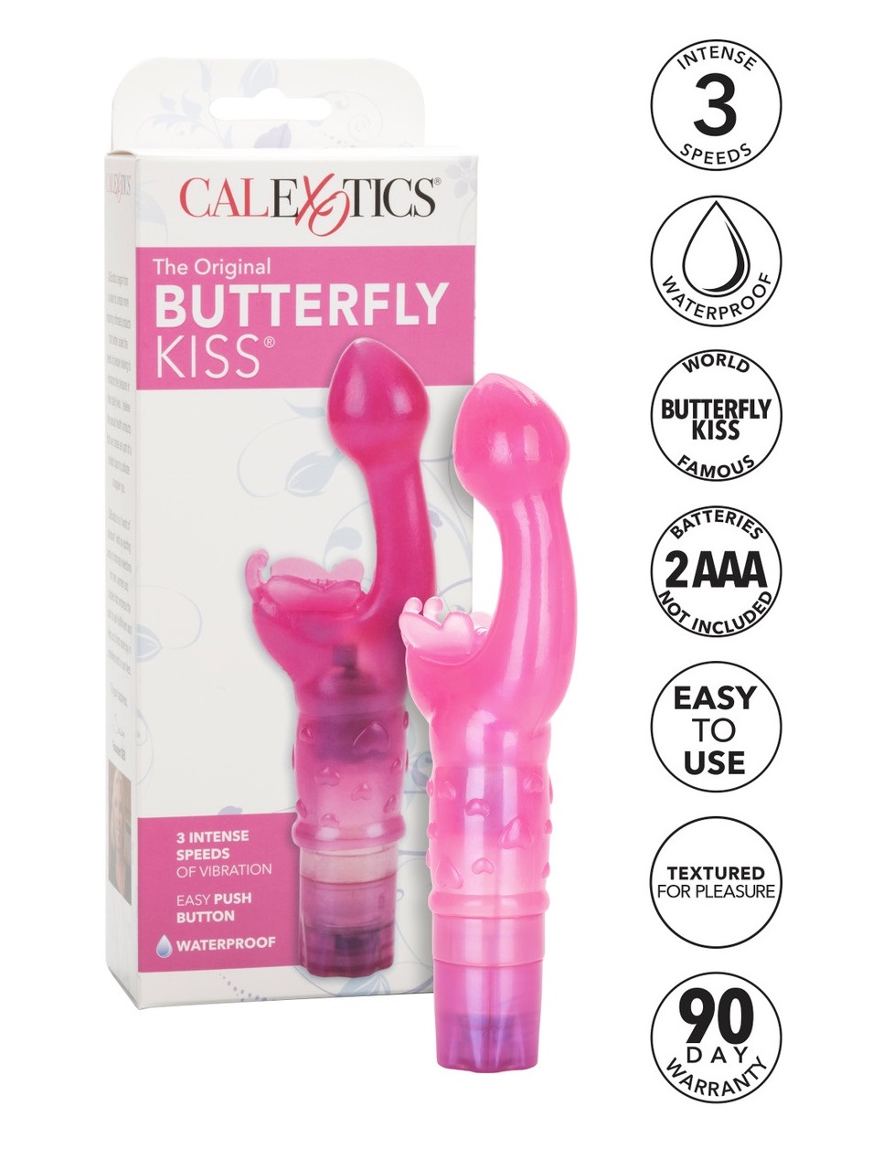 Butterfly Kiss to intrygujący, różowy wibrator zaprojektowany specjalnie z myślą o intymnej satysfakcji. Doskonale wyprofilowana, lekko zakrzywiona główka o kształcie pączka, dla lepszej penetracji, mocno stymuluje punkt G. W tym czasie stymulator łechtaczki - motylek, zapewnia intensywnie przyjemne działanie trzepoczących czułków i skrzydełek, masując i stymulując łechtaczkę. Aby skorzystać z 3 stopni poziomu wibracji, włóż 2 baterie AAA i reguluj je za pomocą wygodnego pokrętła. Wibrator Butterfly Kiss jest wykonany z miękkiego i elastycznego, bezzapachowego TPR, ukształtowany, aby jednocześnie pobudzać, kusić i stymulować łechtaczkę i punkt G. Wykorzystaj egzotyczną atmosferę i odkryj swoje najśmielsze fantazje i pragnienia erotyczne.