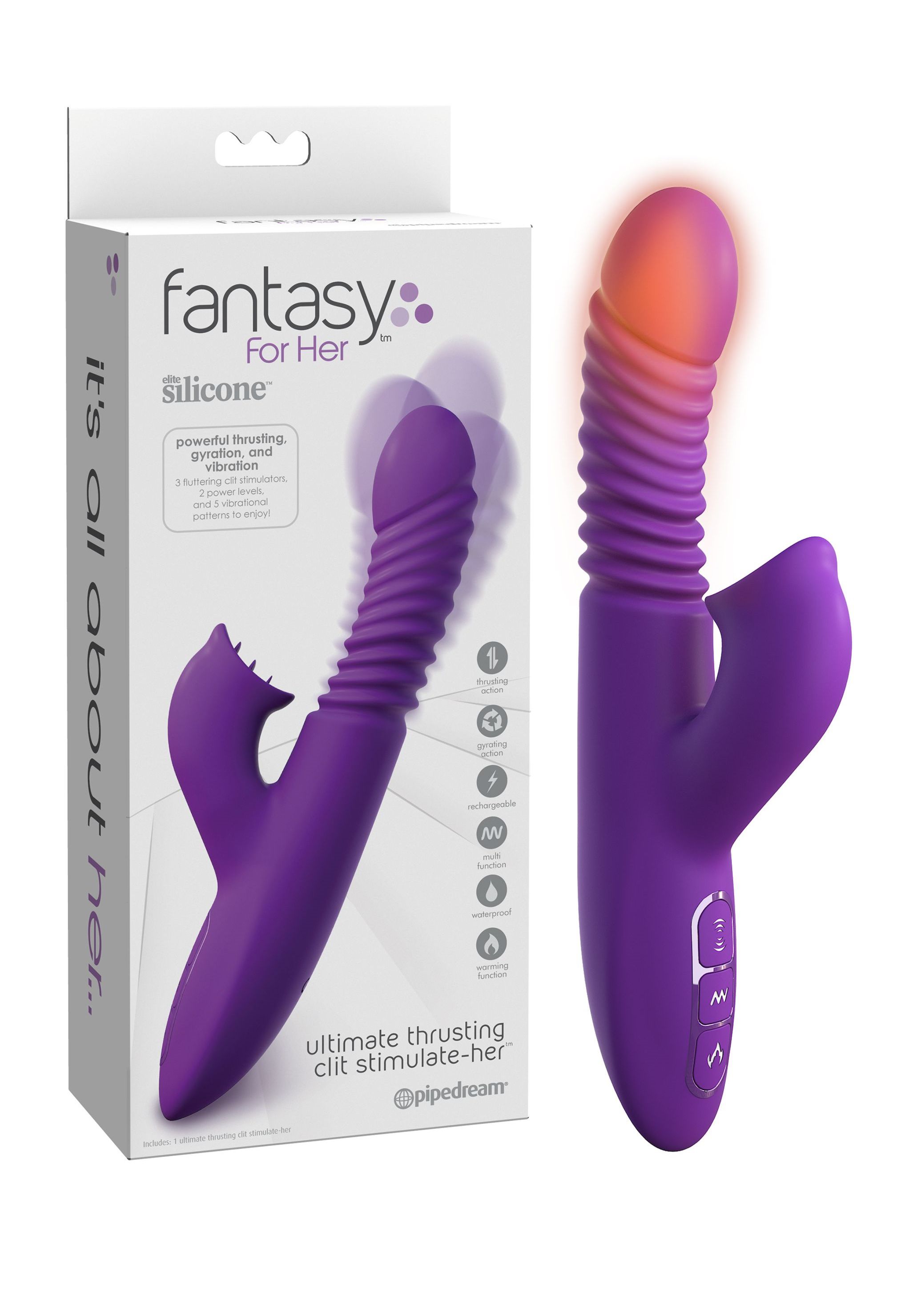 It's all about Her ! Oto wibrator, który spełni wszystkie Jej marzenia - wibracje, pchnięcia, wirowanie, stymulacja łechtaczki i ogrzewanie. Nie mogła zatem się doczekać, aby wypróbować go ! Chciała jak najszybciej wiedzieć, jak to jest poczuć wszystkie te stymulacje naraz. Włączyła podgrzewanie. Ciepło ją rozluźniło, a gładki i aksamitny silikon medyczny równomiernie się ogrzał. Następnie nacisnęła przycisk wibracji, a trzy miękkie stymulatory łechtaczki radośnie zatrzepotały. Naciskała raz po raz, aby sprawdzić wszystkie 2 poziomy mocy i 5 wzorów wibracji. Zaciekawiona nacisnęła ostatni przycisk, aby dodać pchającego wiru do symfonii przyjemności. Łał .... ! Nie mogła już dłużej zwlekać i z niecierpliwością wsunęła między uda Ultimate Thrusting Clit Stimulate-Her. Ciepło działało kojąco. Stymulator łechtaczki trzepotał na jej łechtaczce jak pobudzające skrzydła motyla. Ale to potężne pchnięcia, wirowanie i wibracja stworzyły dla niej ostateczną kombinację rozkoszy. Wiedziała, że nie wytrzyma już długo i że ogromny orgazm jest nieunikniony ! Była pod wrażeniem intensywnych doznań i wiedziała, że będzie pragnęła spędzać więcej czasu z jej ulubionym wibratorem. Siła orgazmu nią wstrząsnęła ! Niedługo potem planowała kolejne intymne spotkanie w pełnej tryskających bąbelków wannie. To harmonijne połączenie stymulujących elementów stworzyło ekscytujące intymne przeżycie, którego nie mogła się doczekać, aby spróbować ponownie ! To jest doskonałość ! Wyjątkowe narzędzie do przyjemności z linii Fantasy For Her amerykańskiej firmy Pipedream łączy w sobie koncepcję wibracji ukochanego królika z głębokimi, wirującymi pchnięciami. Przechylona do przodu i nieco w górę główka wibratora, penetruje Twoją pochwę płynnie, natychmiast szukając i znajdując wewnętrzne strefy erogenne - oczywiście w tym punkt G. Gdy już go znajdzie, przygotuj się na magię ! Wibrator jest wygodnie ładowany magnetycznym kablem USB. Pełne ładowanie akumulatora trwa ok. 2 godzin i daje prawie tyle samo godzin podniecającej zabawy.
