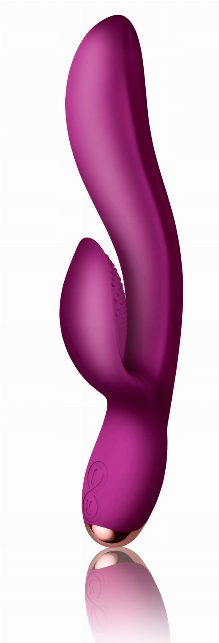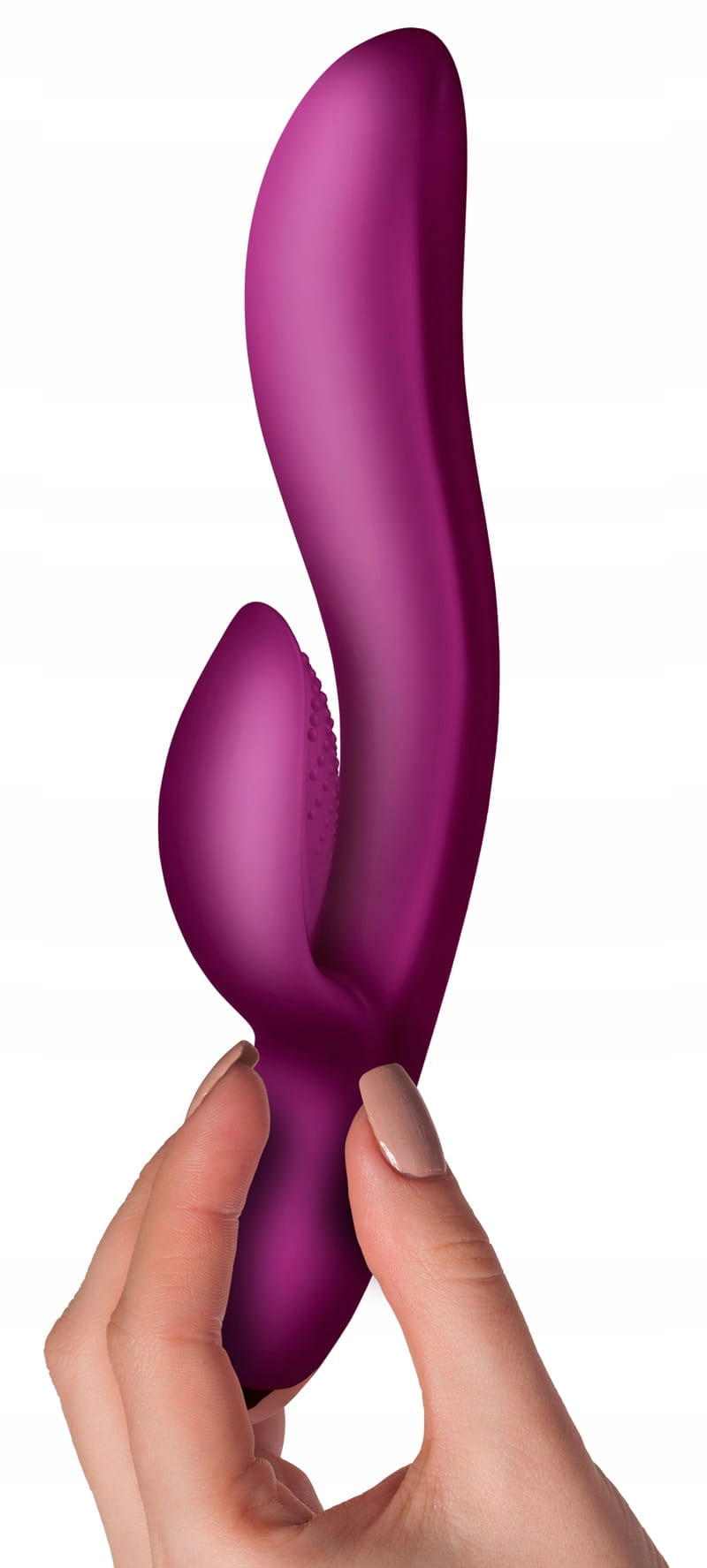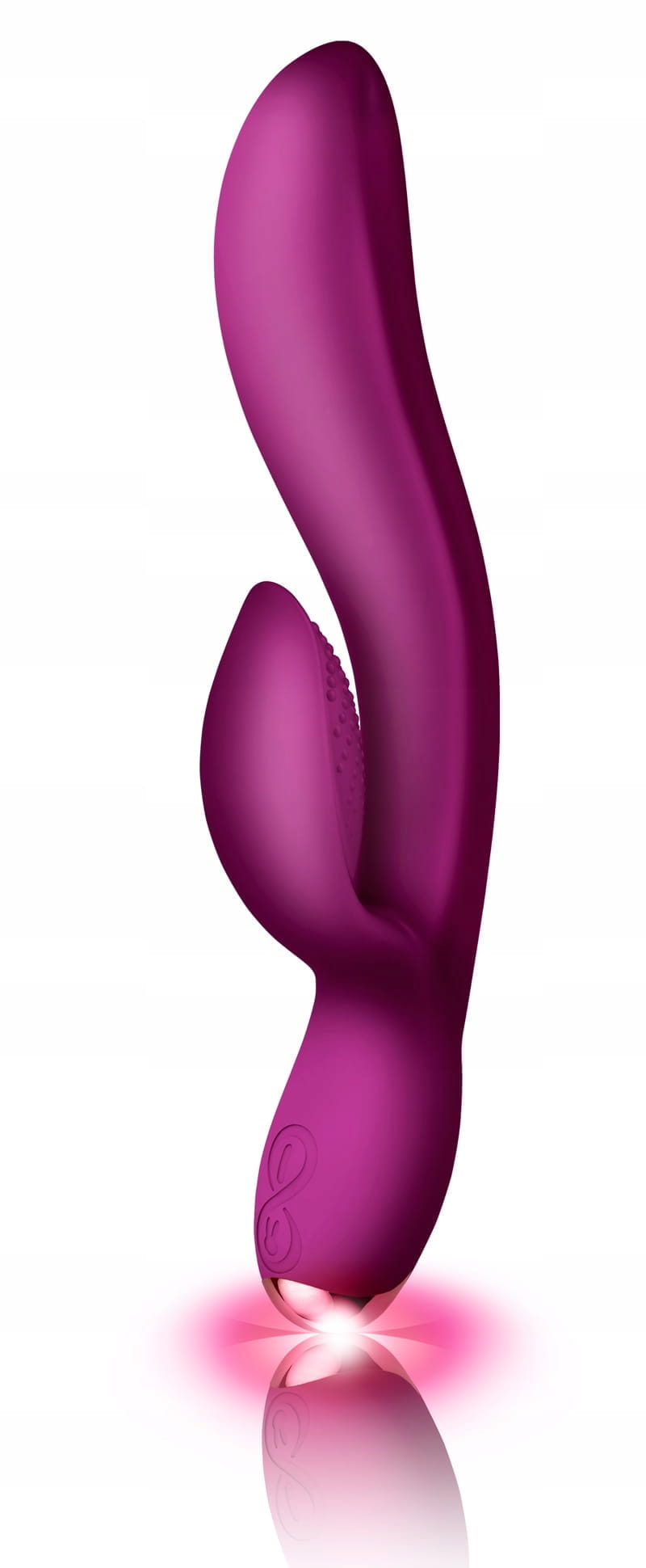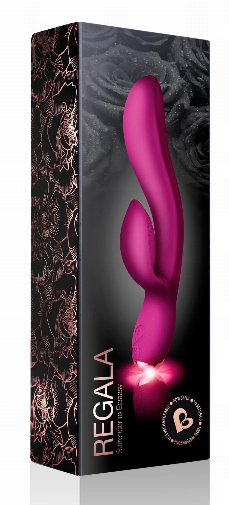 WIELOFUNKCYJNY WIBRATOR Z KRÓLICZKIEM REGALA USB Poddaj się ekstazie z tym aksamitnym wibratorem. Regala ma wyrafinowany design oraz wydłużony i zakrzywiony kształt, idealny aby dotrzeć do najbardziej intymnych obszarów i osiągnięcia orgazmu. Posiada 2 mocne silniki, których możesz używać niezależnie, aby spersonalizować ulubiony tryb wibracji dający największą przyjemność. Silniki te są strategicznie rozmieszczone w stymulatorze i w czubku wibratora. Zamknij oczy i weź głęboki oddech... Zmysłowy i aksamitny dotyk Regali, wyrafinowane linie i ergonomiczne wymiary zostały umiejętnie dopasowane, aby doprowadzić Cię do dzikiego orgazmu. Przygotuj się więc na długi wieczór, bo z doświadczenia wiemy, że skończysz zabawę dopiero wtedy, gdy wypróbujesz wszystkie 10 rodzajów wibracji i to aż w 2 trybach ! Znakomity design i aksamitny, miękki silikon otaczają potężne, 2 niezależnie pracujące silniki - jeden w stymulatorze łechtaczki a drugi w wale wibratora. Zapewnią najwyższą satysfakcję z każdego pulsującego koloru bijącego serca LED, gdyż zmiana koloru diody jest zsynchronizowana z wibracjami gadżetu. Wibrator jest całkowicie bezpieczny dla ciała i przyjemny w dotyku, bo wykonany z aksamitnego i miękkiego silikonu medycznego. A jedno pełne, ładowanie akumulatora poprzez magnetyczny kabel USB pozwoli Ci na 3 godziny przyjemności. Regala jest w 100% wodoodporna, więc nie zawahaj się używać jej pod prysznicem lub w wannie. Pamiętaj, by podczas użytkowania wybierać jedynie lubrykanty na bazie wody, gdyż inne mogą doprowadzić do uszkodzenia powierzchni zabawki. Do czyszczenia najlepiej używać wody i delikatnego mydła, lub specjalnych środków do zabawek typu Toy Cleaner.