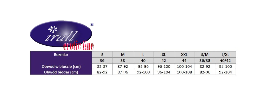 Półbiustonosz ozdobiony z przodu kokardką, zapinany z tyłu na dwurzędowe haftki z możliwością regulacji. Posiada regulowane ramiączka. Gorsecik usztywniany pionowymi fiszbinami, posiada regulowane paseczki do pończoch. Zapinany z tyłu na dwurzędowe haftki z możliwością regulacji. Stringi ozdobione z przodu kokardką.