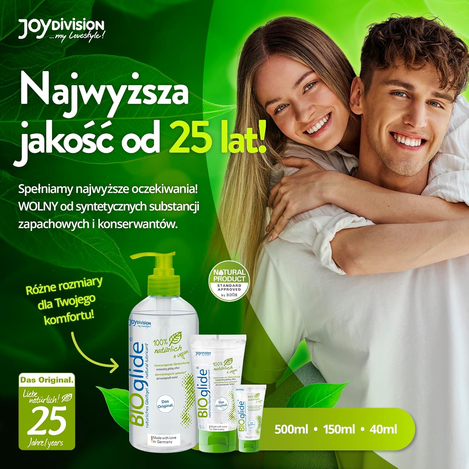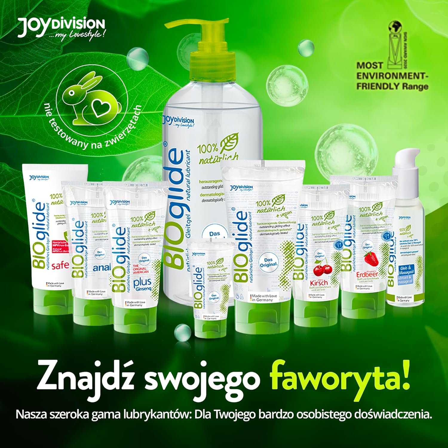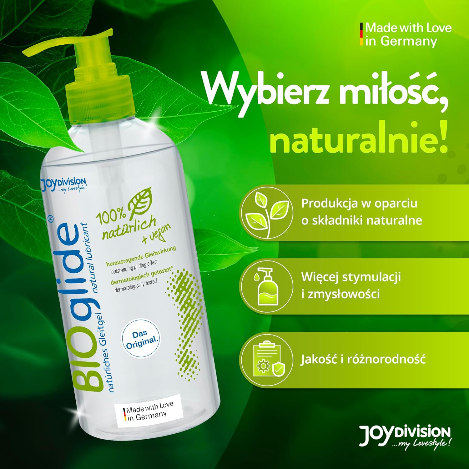 Pierwszy na świecie w 100% naturalny i wegański lubrykant na bazie wody ! BIOglide to wysokiej jakości produkt renomowanej marki JoyDivision wyprodukowany w Niemczech. Wyprodukowany na bazie naturalnych składników i nie zawiera konserwantów. Posiada znakomite właściwości poślizgowe. Zachowuje naturalne pH skóry ! Miłość to najbardziej naturalna rzecz na świecie, a dzięki BIOglide kochacie się w naturalny sposób. Lubrykant BIOglide utrzymuje delikatną wilgotność narządów płciowych i łagodzi dyskomfort intymny. Wprowadź zatem swoje fantazje seksualne w życie - samodzielnie lub we dwoje dzięki temu całkowicie naturalnemu lubrykantowi, którego wartość pH jest znacznie bliższa naturalnemu nawilżeniu pochwy, niż jakiegokolwiek innego lubrykantu. PH lubrykantów JoyDivision mieści się w zakresie od 4,6 do 5,2 i dlatego jest doskonale dostosowana do wartości pH flory pochwy. BIOglide to certyfikowane i naturalne składniki w połączeniu z długotrwałym nawilżeniem - w ten sposób miłość staje się czystą przyjemnością ! Okolice intymne to jeden z najbardziej wrażliwych i delikatnych obszarów naszego ciała. To sprawia, że składniki produktów, których używamy w tym obszarze, są tym ważniejsze ! BIOglide jest w 100% naturalny i wegański. Jako organiczny lubrykant, produkt całkowicie pozbawiony jest syntetycznego zapachu, barwników i konserwantów, zapewniając maksymalną radość z miłości. BIOglide utrzymuje jedwabistą i wilgotną pochwę, a także nadaje się do stosowania analnego. Certyfikat ,,Natural Product Standard" zatwierdzony przez BDiH daje Ci pewność, że BIOglide spełnia wysokie standardy rynku BIO.