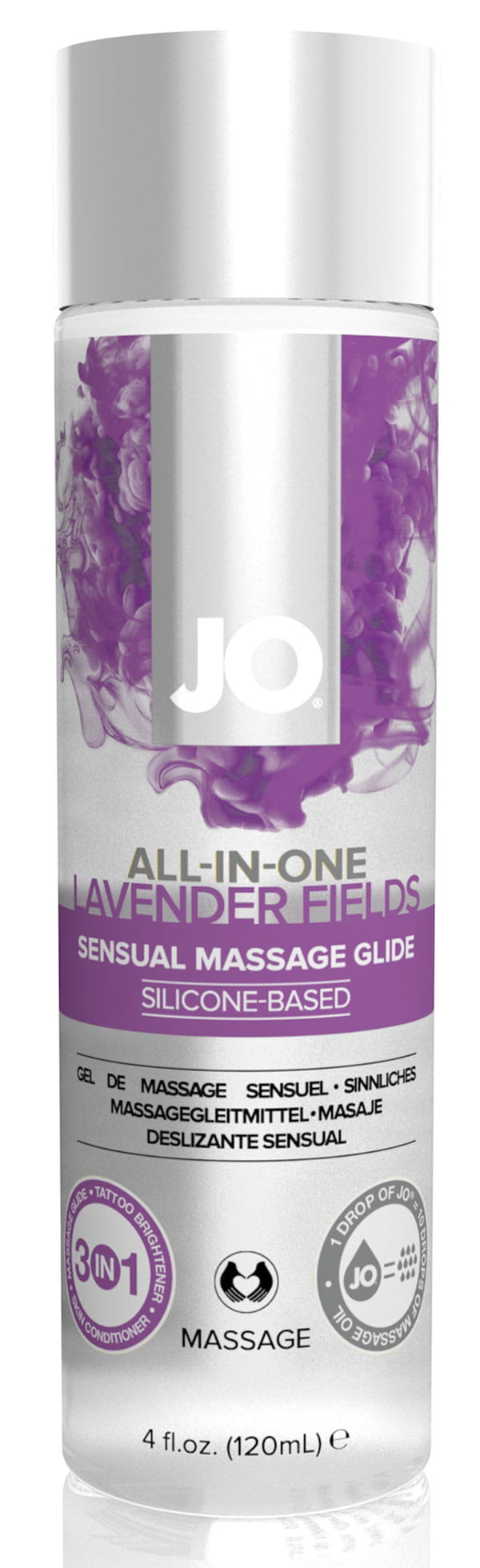 ŻEL DO MASAŻU SYSTEM JO ALL-IN-ONE LAVENDER 120 ML Żel do masażu System JO® all-in-one lavender wyróżnia się silikonową formułą, która jest niezwykle wydajna. Jedna niewielka kropla żelu jest równa 10 kroplom tradycyjnego olejku do masażu! Jego jedwabista konsystencja dodatkowo zwiększa doznania płynące z masażu. Dzięki wodoodporności kosmetyku masaż można wykonać również pod prysznicem czy w trakcie relaksującej kąpieli. Delikatny, lawendowy zapach żelu unosi się powietrzu, wprowadzając zmysłową atmosferę. Co ciekawe, żelu System JO® all-in-one lavender można używać także jako odżywki do skóry oraz rozświetlacza do tatuażu. Kosmetyk nie zawiera parabenów i gliceryny. Nie wywołuje reakcji alergicznych ani podrażnień skóry. Nie należy stosować żelu do masażu z silikonowymi zabawkami erotycznymi oraz lateksowymi prezerwatywami, ponieważ może uszkodzić ich powierzchnię.