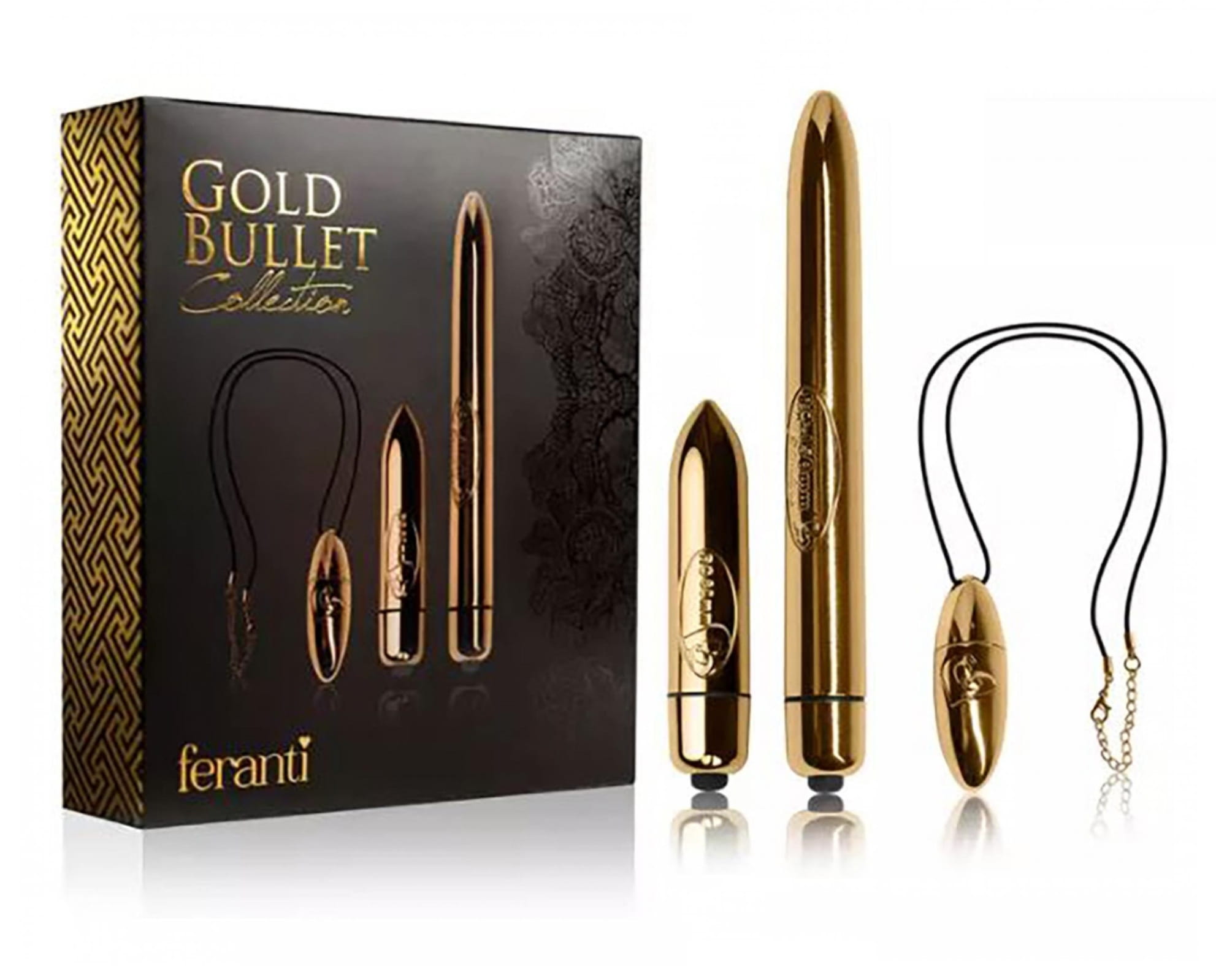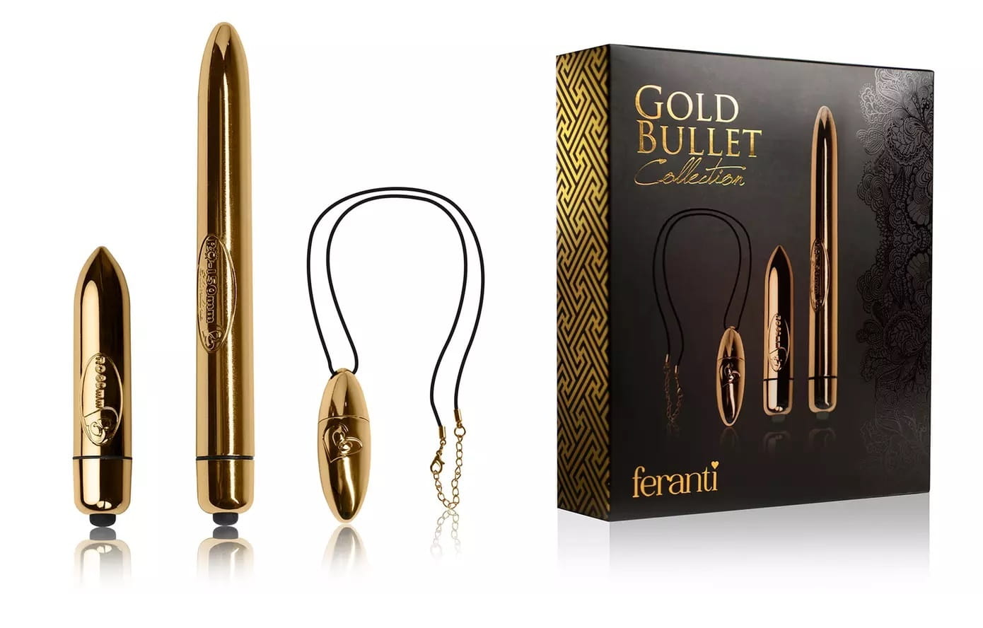 ZESTAW 3 WIBRATORÓW ROCKS OFF GOLD BULLET COLLECTION Zestaw wibratorów Rocks Off Feranti - kolekcja Gold Bullet. Rocks Off Gold Bullet Collection to zestaw 3 wibratorów z luksusowym, złotym wykończeniem, charakteryzujących się eleganckim, dyskretnym wzornictwem i bardzo intensywnymi wibracjami. Wspaniały pomysł na zestaw upominkowy, gdyż złote wibratory wcale nie wyglądają jak zabawki erotyczne. Mogą być jednak świetnymi sojusznikami w drodze na szczyt przyjemności. W zestawie są 3 wibratory o różnych kształtach i rozmiarach. Poznajmy zatem ich lepiej. Najmniejszy wibrator - jajeczko typ Ro-VAL przypomina medalion w kształcie migdała, który z łatwością można nosić zamiast biżuterii. Nikt nigdy nie będzie cię podejrzewał o „takie” rzeczy ;)). Wypełnij arsenał niezbędnych rzeczy w damskiej torebce tym małym urządzeniem - w każdej chwili może się przydać ! Drugie urządzenie to mini wibrator, który swoją mocą nie ustępuje pełnowymiarowym wibratorom. To skuteczna „broń”, która może „przebić się” przez ścianę problemów z osiągnięciem orgazmu dla nawet najbardziej wymagającej kobiety. Spróbuj ! Trzecim, nie mniej efektownym elementem złotej kolekcji jest cienki i elegancki wibrator, który pozwala na osiągnięcie nieziemskiej błogości. Żadna trudno dostępna strefa erogenna nie będzie w stanie się przed nim „ukryć”. Wystarczy 15 cm długości, aby wniknąć w głąb. Poczuj całą moc i luksus elementów tej kolekcji - nie odmawiaj sobie takiej przyjemności i podaruj zestaw wibratorów Gold ! 1) Jajeczko RO-VAL - potężny, ale prawie bezgłośny wibrator. Mocna, cicha i dyskretna wibracja ze zmienną prędkością. Luksusowe złote wykończenie. Ale to nie wszystko: RO-VAL to również wykwintny, pozłacany wisiorek, który ozdobi Twoją szyję i nie będzie wyglądał jak obcy przedmiot w szkatułce z biżuterią. RO-VAL jest gotowy towarzyszyć Ci w każdym miejscu. Wymagane są 2 baterie LR44 ( w zestawie ) Materiał : bezpieczne i trwałe tworzywo ABS Wymiary : 1,8 cm x 5,5 cm x 1,8 cm |