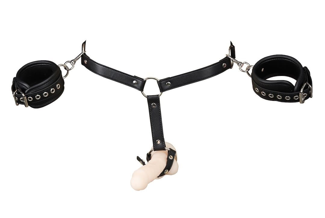 Zestaw do krępowania został zaprojektowany z myślą o tych, którzy pragną dodać pikanterii i kontroli do swoich zabaw w sypialni. Składający się z kajdanek, uprzęży i opaski na penisa, każdy element jest starannie wykonany z materiału imitującego skórę oraz z metalu, co zapewnia trwałość i wygodę podczas użytkowania. Elementy są ze sobą połączone i można je regulować, aby dopasować do odpowiednich wymiarów.