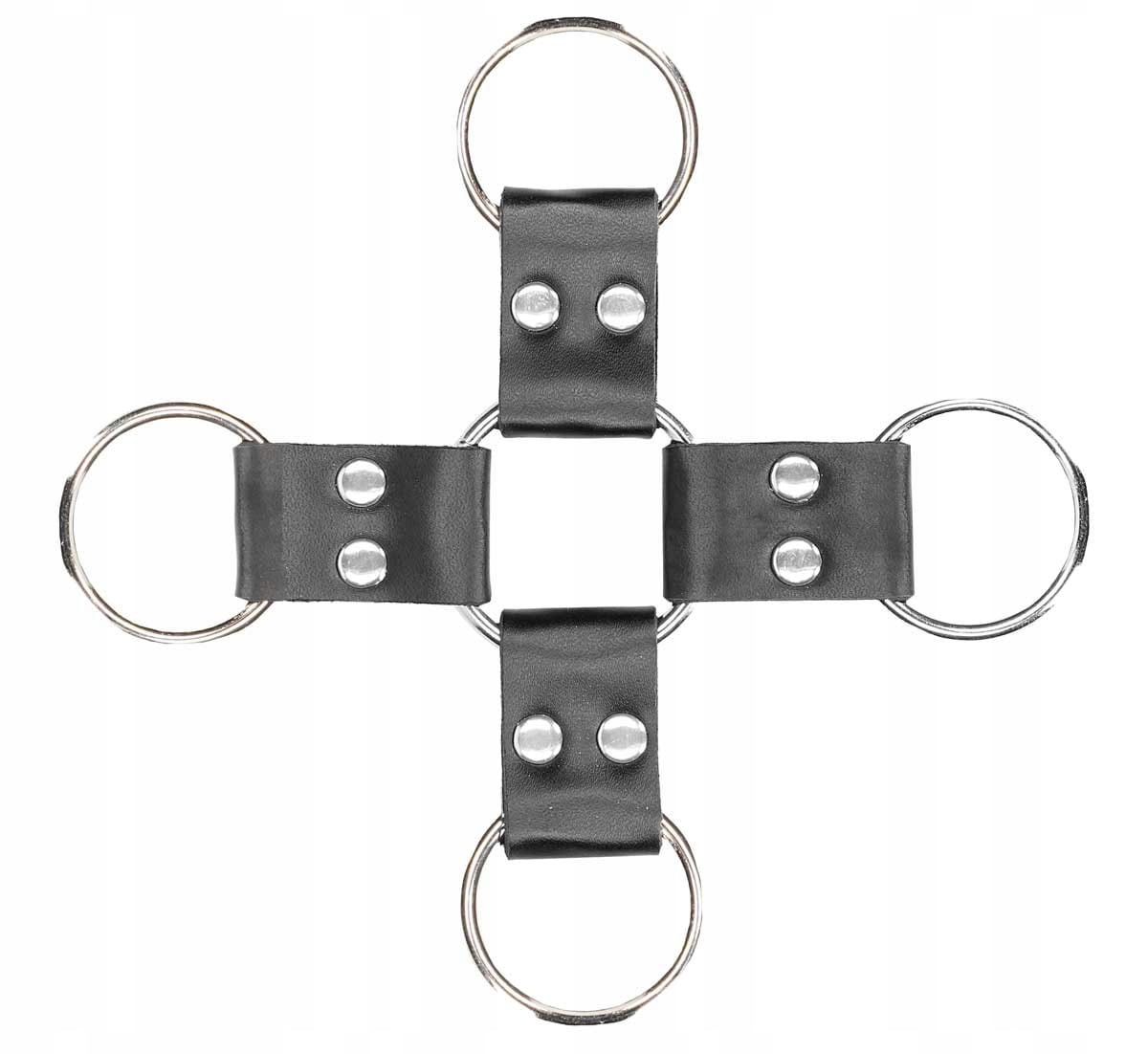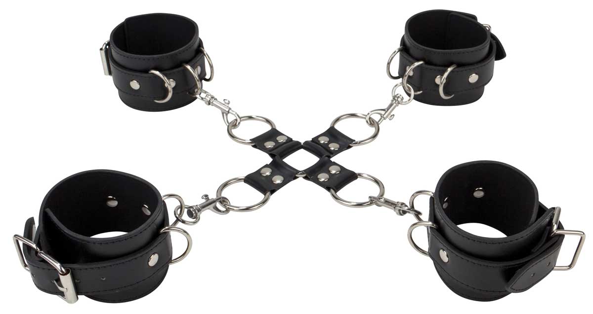 Bardzo efektowny i funkcjonalny zestaw, złożony z kajdanek na ręce i nogi połączonych krzyżakiem.