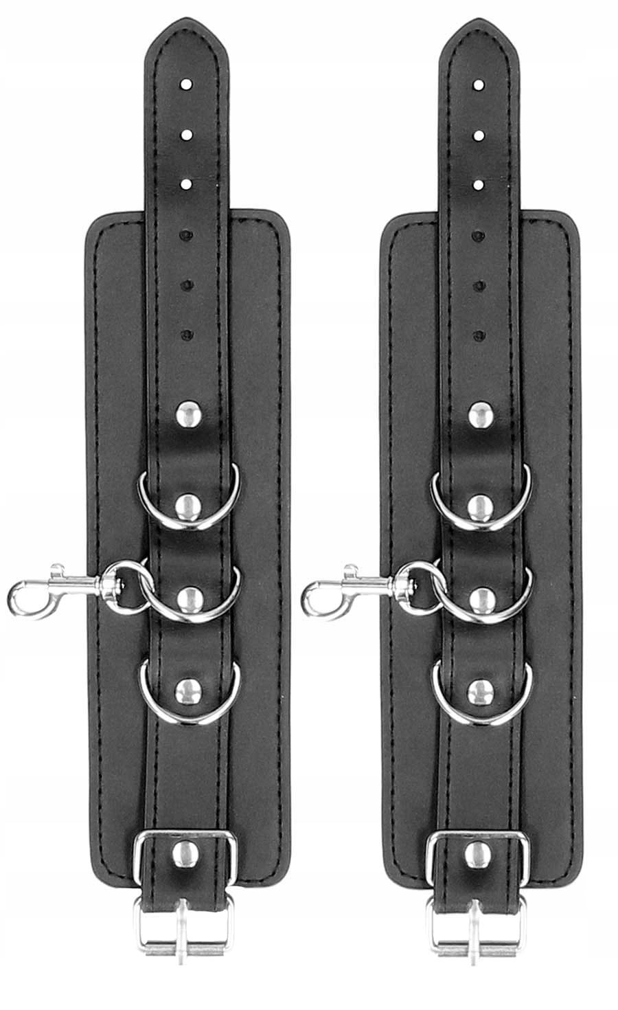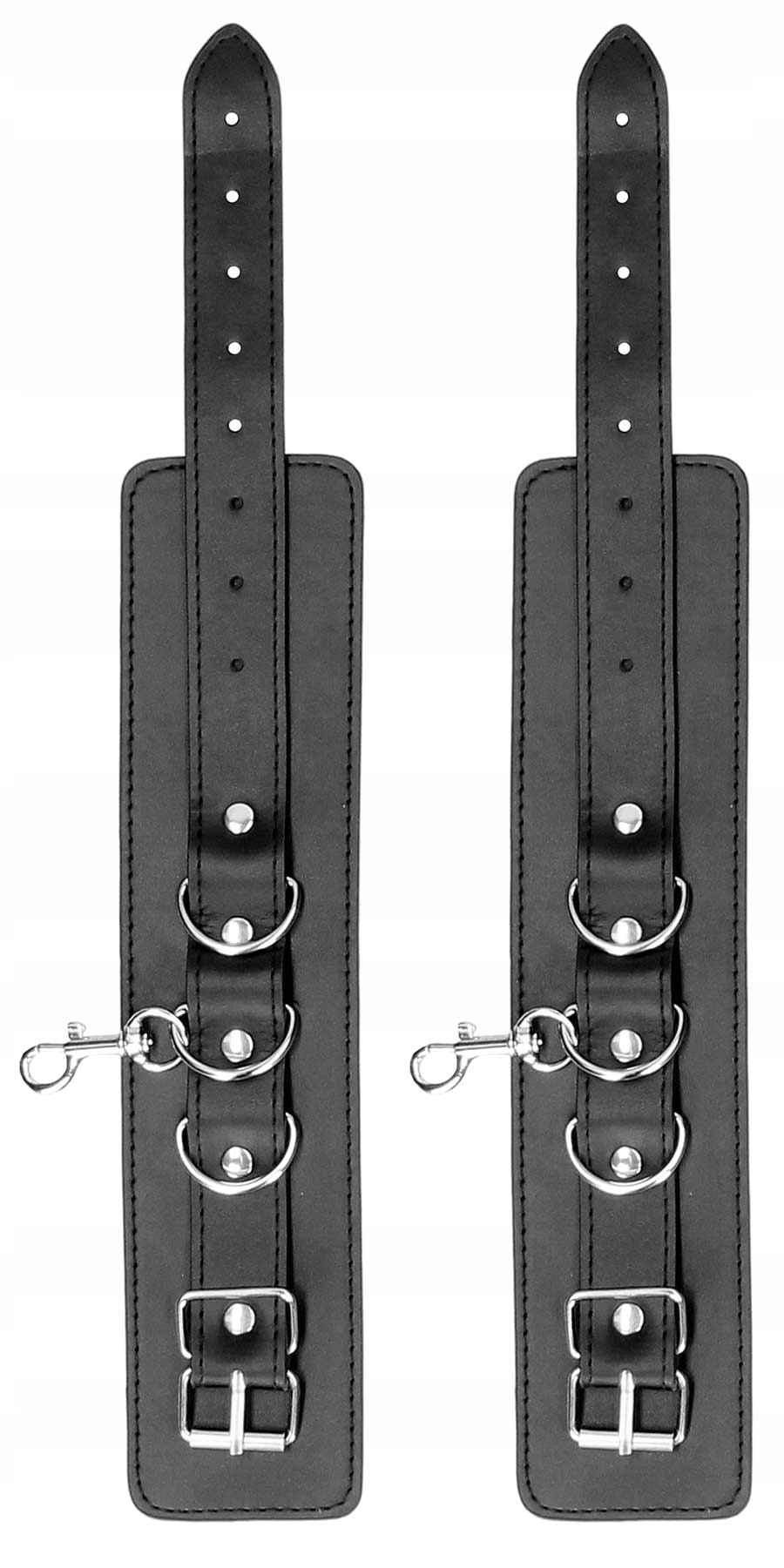 Kajdanki są szerokie, w formie mankietów i wyposażone dodatkowo w system złożony z pięciu pierścieni i czterech karabińczyków, oraz kilku kółek.