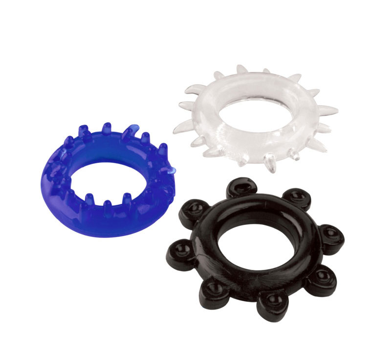 Pierścienie erekcyjne wykonane z bardzo rozciągliwej gumy, wolnej od ftalanów. Pasują na każdego penisa. Pierścienie, poprzez ucisk penisa skutecznie wydłużają czas trwania stosunku. Dzięki swoim nieregularnym kształtom przyjemnie podrażnia pochwę i łechtaczkę. Każdy pierścień w innym rozmiarze - nałożone w trakcie wzwodu penisa u jego nasady zapewnią maksymalną erekcję aż do samego końca! Produkt wykonany jest z miękkiego materiału, który jest bezpieczny dla skóry, higieniczny, a jednocześnie wytrzymały. Wraz z pierścieniami używaj tylko lubrykantów na bazie wody.