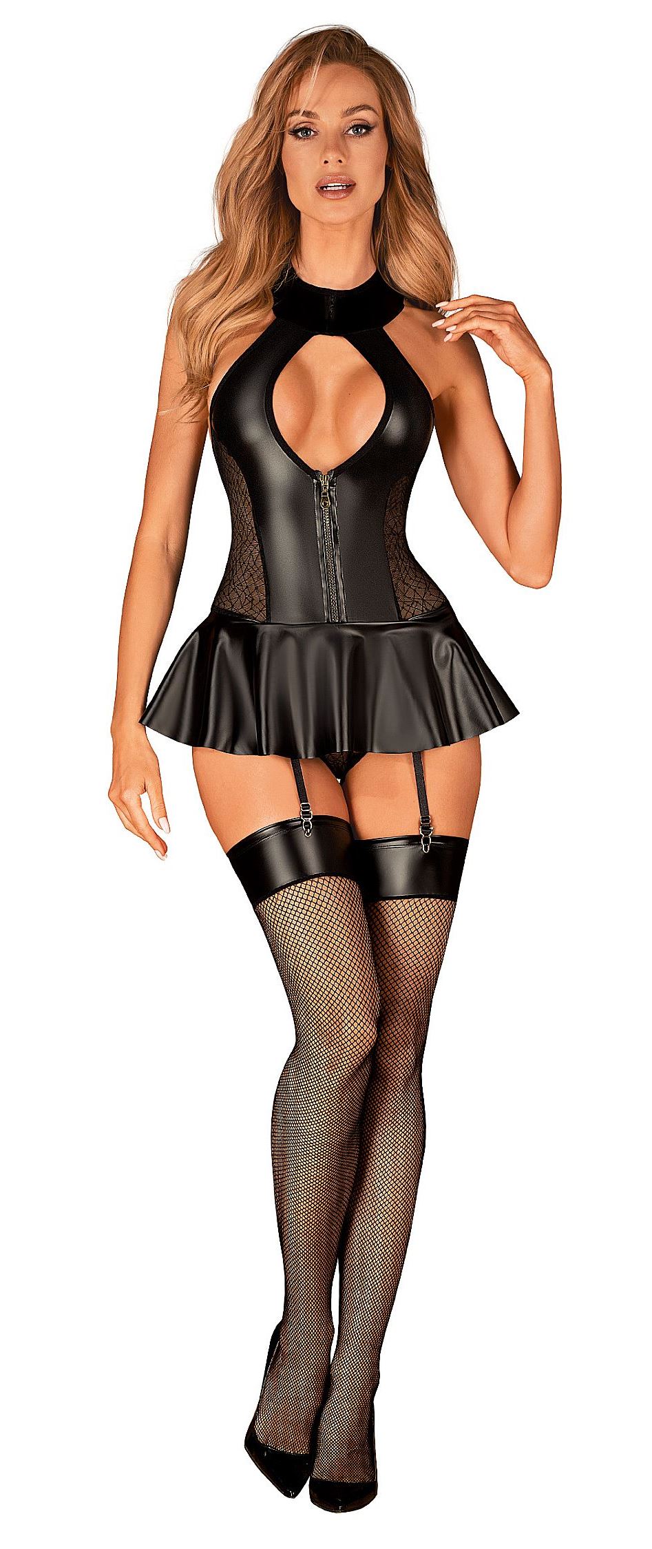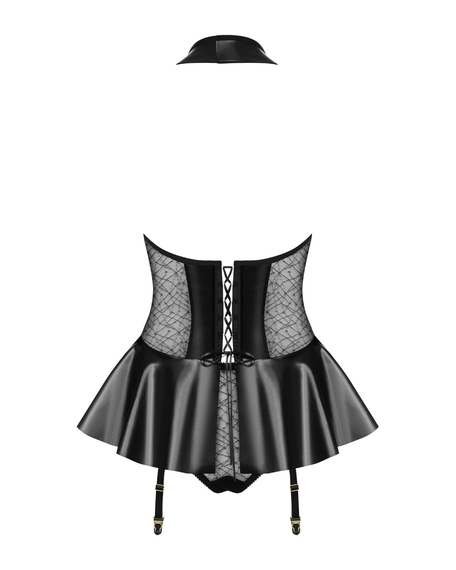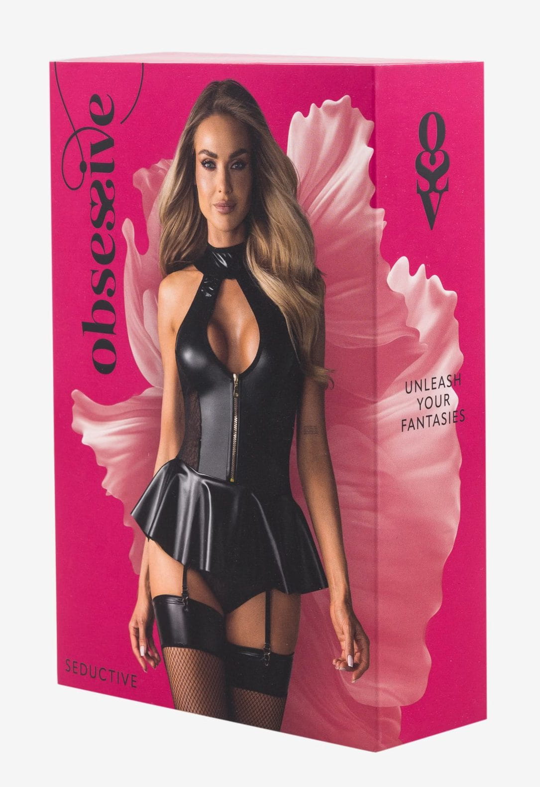 Chcesz iść o krok dalej ? Szukasz czegoś niezwykle zmysłowego ?! Wypróbuj seksowny gorset Seductive, który zaskoczy i Ciebie i Jego. Niespotykane połączenie materiałów, rozcięcie na biuście i kuszący zameczek – takie atrakcje tylko w Obsessive ! Ten gorset to zaskakujące połączenie materiału typu „wetlook” oraz siateczki zdobionej subtelnym wzorem. Góra gorsetu seksownie okala szyję, przechodząc w niezwykle odważne wycięcie na biuście zakończone zamkiem błyskawicznym. Z tyłu gorsetu znajduje się sznurowanie – zapewnia wygodę i dopasowanie, będąc jednocześnie kuszącą i bardzo kobiecą ozdobą. Całość dopełnia rozkloszowany dół - baskinka, która dodaje dziewczęcego wdzięku. Dzięki zapięciu na szyi, suwakowi z przodu i regulacji z tyłu gorset łatwo i szybko można zdjąć i założyć. Czarny gorset Seductive to propozycja niecodziennej, wręcz zaskakującej stylizacji na intymne spotkanie w sypialni. Mimo że jest bardzo kuszący, nie odkrywa zbyt wiele, pozostawiając dużo miejsca na wyobraźnię. Odpinane paski do pończoch to dodatkowy atut gorsetu. Dzięki nim możesz dobierać różne wzory i kolory pończoch, za każdym razem prezentując się w nieco innej odsłonie.